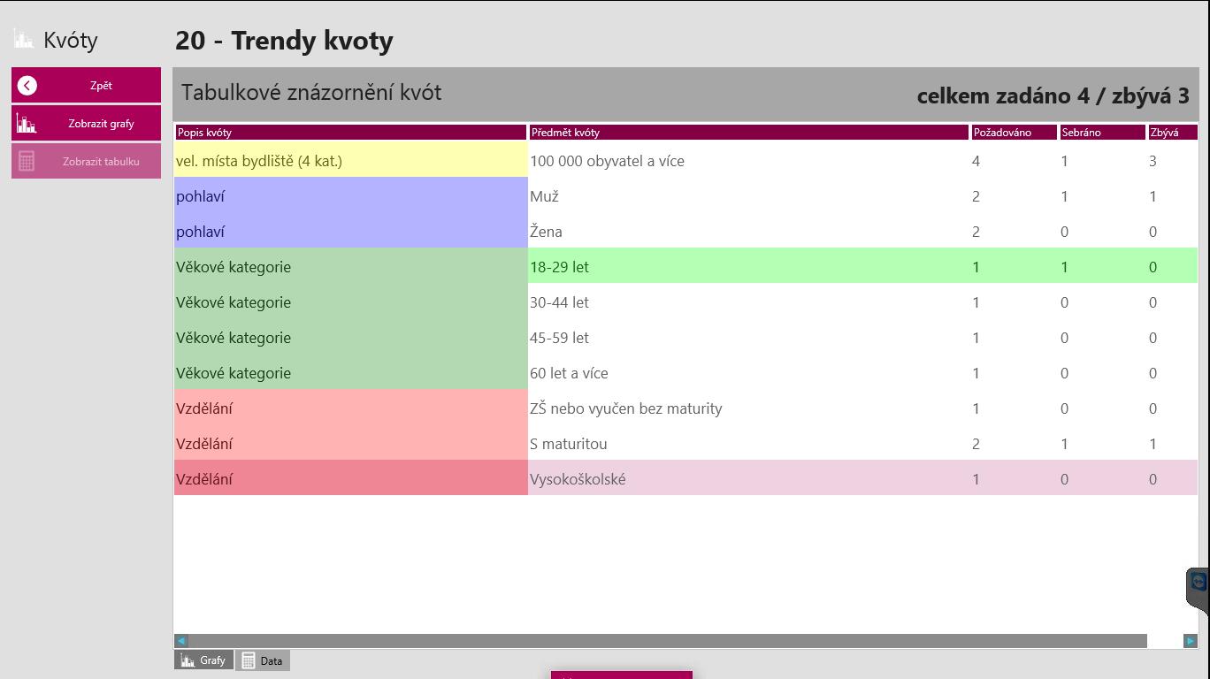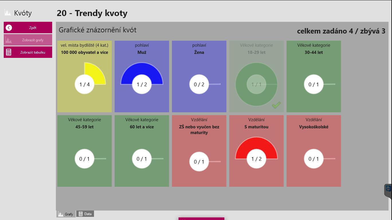 V grafu/grafickém zobrazení kvót (první obrázek) je dynamicky znázorněn jak zadaný počet rozhovorů, tak i počet splněný – například vidíte, že pokud máte někde rozhovory splněné (zde tomu tak je u věkové kategorie 18-29 let), je políčko celé zelené, „koláč grafu“ je úplný a navíc máte pole „odfajfkované“: